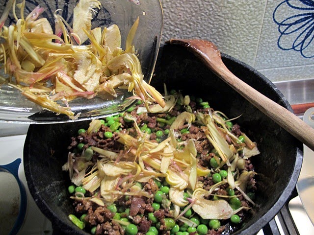 Appena la cipolla sarà imbiondita, aggiungere la carne di manzo e mischiare bene per 5 minuti.